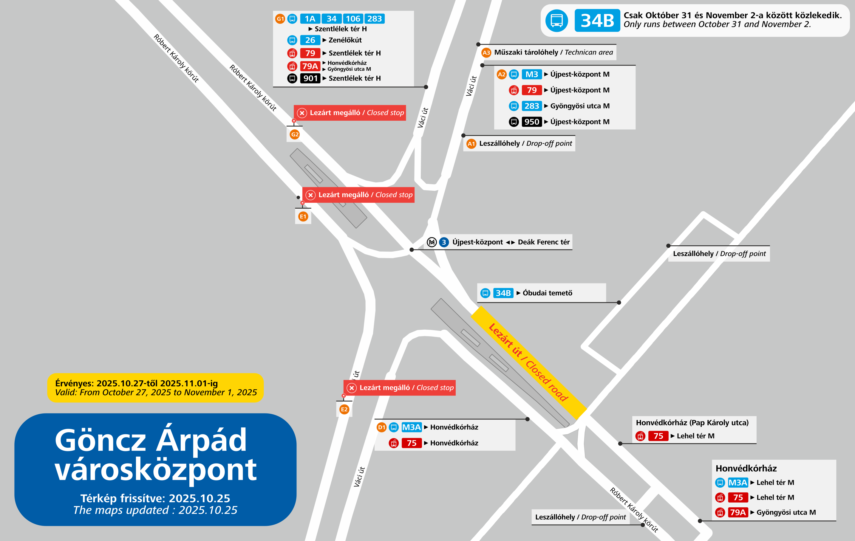 A Göncz Árpád városközpont M megállót nem érinti egy írányba se valamint a Lehel tér M felé a Népfürdő utca / Árpád híd megállót se.